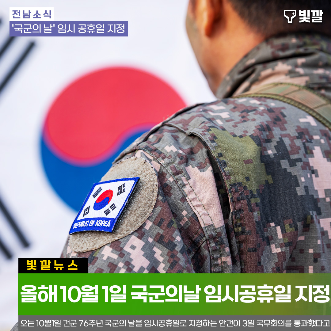 올해 10월 1일 국군의날임시공휴일 지정안녕하세요 빛깔입니다! 다가오는 추석, 긴 공휴일과 더불어직장인은 물론 학생들도또 언제 합법적으로 쉴 수 있을까?미리 확인하고 기대하게 되는 것 같은데요~ 방금 들어온 따끈따끈한 소식입니다! 바로 올해 국군의 날인10월 1일이임시공휴일로 지정될 수도 있다는 사실!! 바로 알아보러 갈까요? 올해 10월 1일국군의날 임시공휴일 지정 주요내용✅건군 76주년을 맞아 국군의 날(10월 1일)을임시공휴일로 지정하는 안건이 3일 국무회의를 통과 ✅이번 국군의 날 임시공휴일 지정은국민의 안보 의식 고취,국군의 사기진작 및 자긍심 제고,국민과 함께하는 국군의 날 행사 개최 등을도모하고자 추진 ✅인사처는 임시공휴일 확정을 위해 대통령 재가,관보 공고 등 후속 조치에 즉시 착수한다고광..